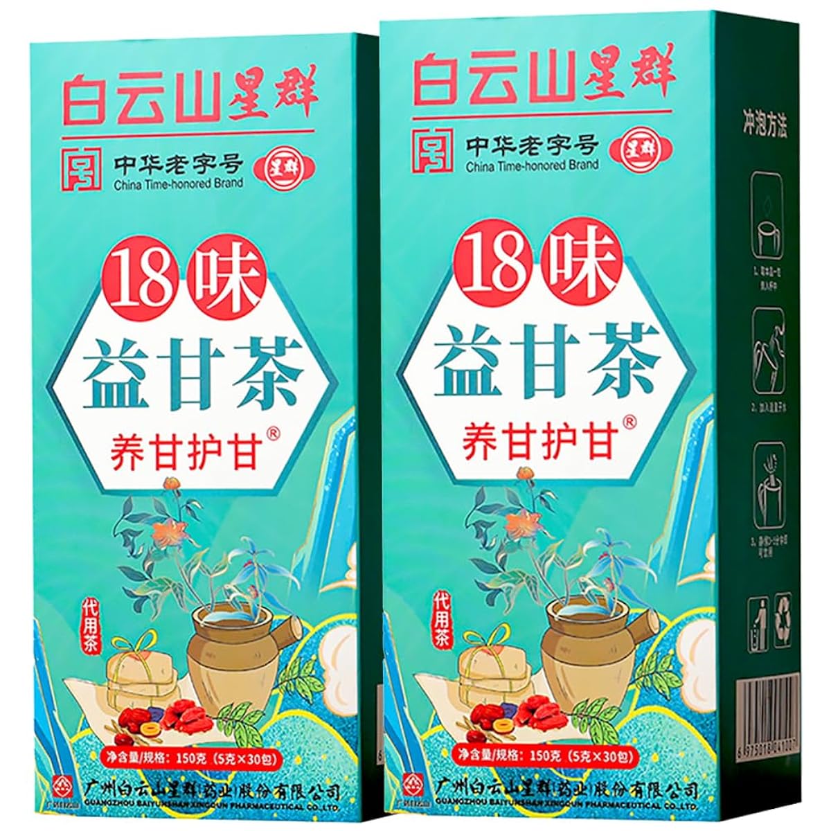 Graines de cassia, aubépine, zeste d’orange, réglisse, feuilles de mûrier, racine de kudzu, igname, gardénia, rose rouge double, jujube, racine de bardane, fruit du moine, pissenlit, chrysanthème, goji, osmanthus, gorgone, bergamote.